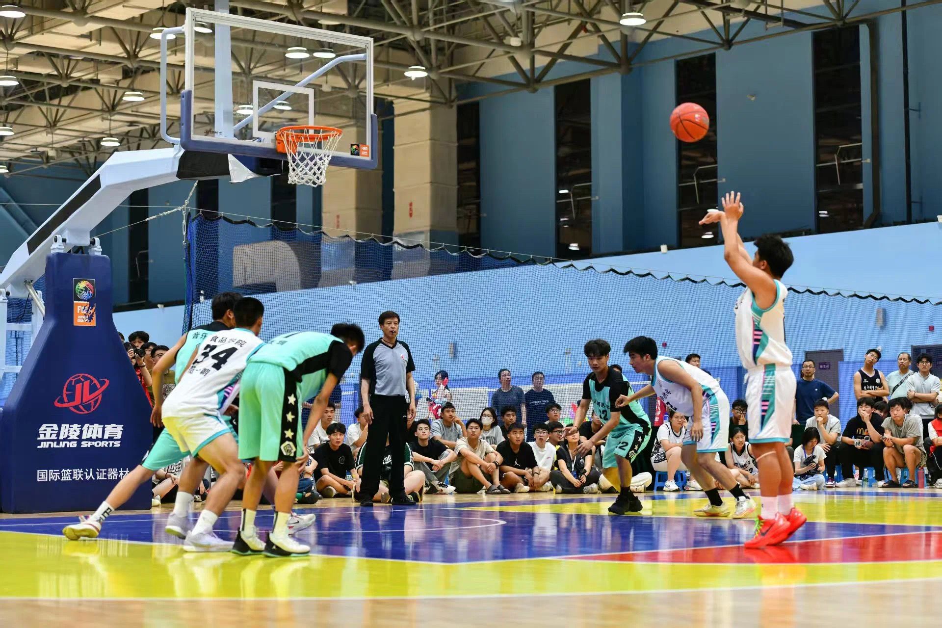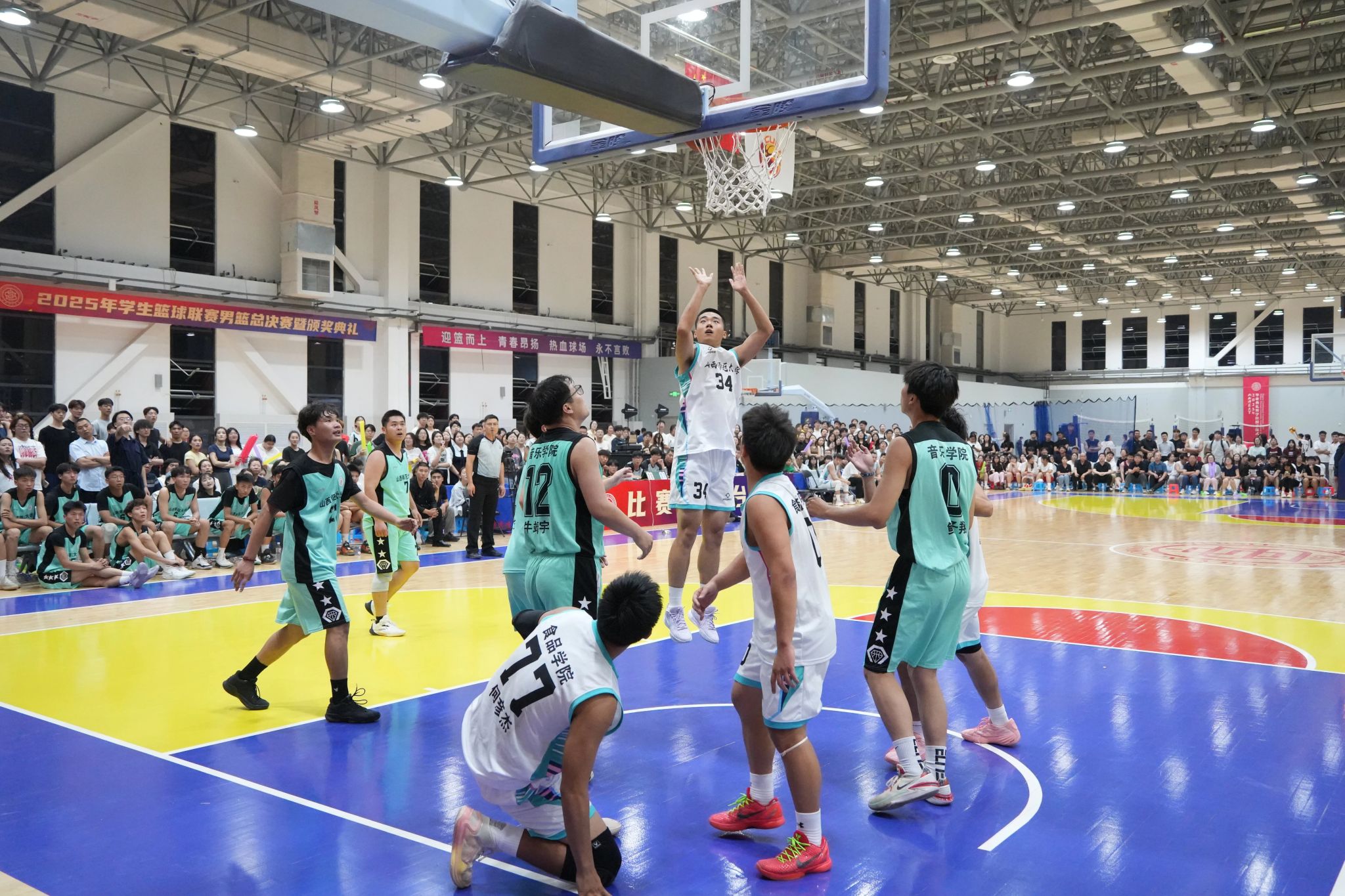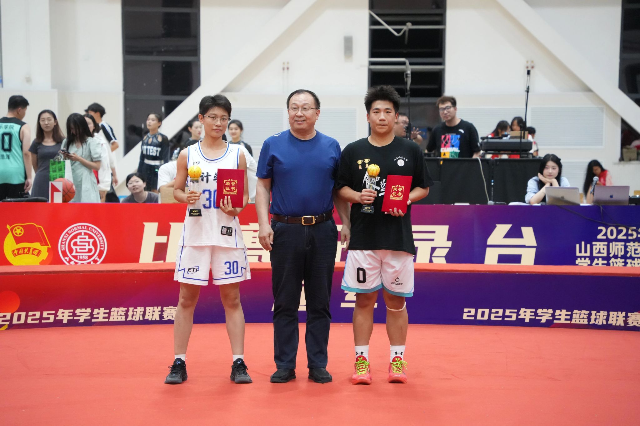 院领导班子全体成员、学院教师、员工纷纷前往现场助阵。比赛开始前,现场气氛热烈非凡,双方球迷齐聚赛场,为各自的球队呐喊助威。随着裁判一声哨响,比赛正式拉开帷幕。双方比分交替上升,场面十分胶着。公司男篮的队员们始终保持着顽强的斗志,在篮板球争夺上不遗余力,在进攻中,打出了流畅的配合。经过近两个小时的激烈比拼,公司男篮赢得山西师范大学2025年员工篮球联赛总冠军!0号球员李玥琨荣获最有价值球员奖。