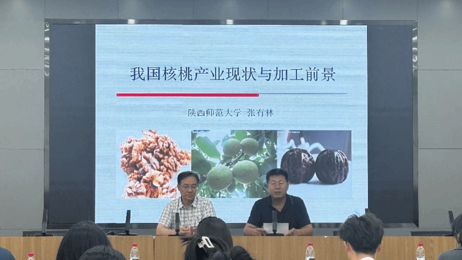 张有林教授在题为《我国核桃产业现状与加工前景》的报告中,首先介绍了核桃的营养价值及其对人类的贡献,指出核桃中亚油酸和α-亚麻酸等不饱和脂肪酸的含量高达50%。随后,张教授系统梳理了全球及我国核桃资源的分布情况,强调我国核桃种植面积和产量均居世界首位。最后,重点阐述了核桃可加工产品(如核桃油、核桃发酵制品、核桃蛋白粉等)、我国核桃加工业的发展现状,以及其团队在核桃相关领域取得的研究成果和开发的系列产品。报告内容丰富,信息详实,使在场师生受益匪浅。